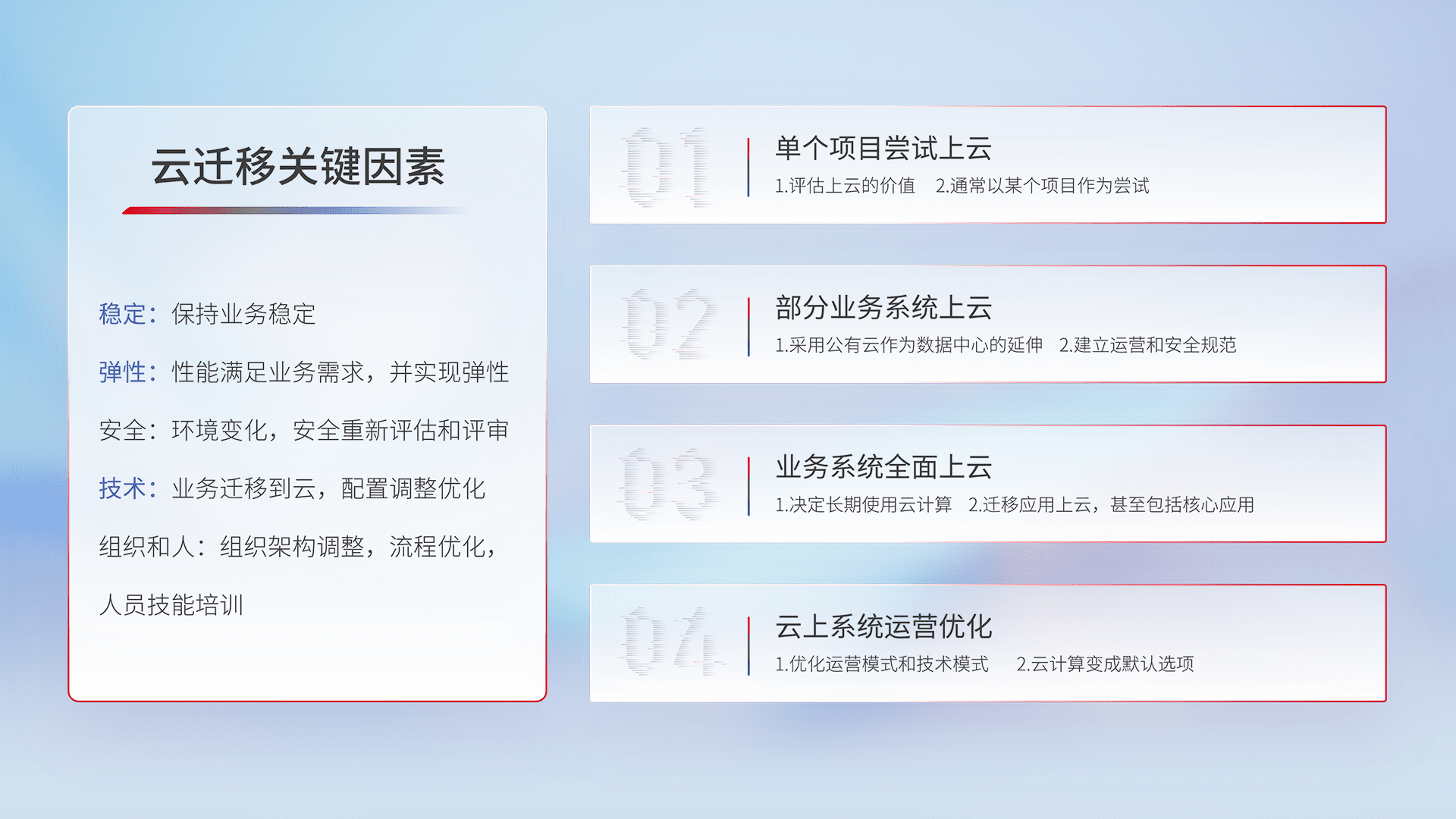 结合实际业务,,,从规划设计、、云平台选型、、、云原生改造、、数据迁移、、、集成交付,,,迁移全过程为客户识别最佳上云路径,,做好风险识别管理,,设计网络架构、、、身份权限、、安全审计合规、、操作审计、、、、日志审计、、、监控告警策略、、多站点容灾设计等,,,,对云上基础设施进行整体规划,,,提升IT治理水平,,,,以满足弹性、、高可用、、、、高性能的需求。。。。